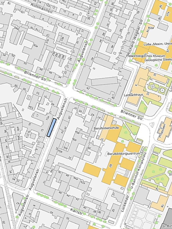 Im markierten Bereich der Augustenstraße (siehe Karte) stellt das Baureferat Baumgruben für zwei neue Baumstandorte her. Im Winter 2025/2026 erfolgt die Pflanzung.