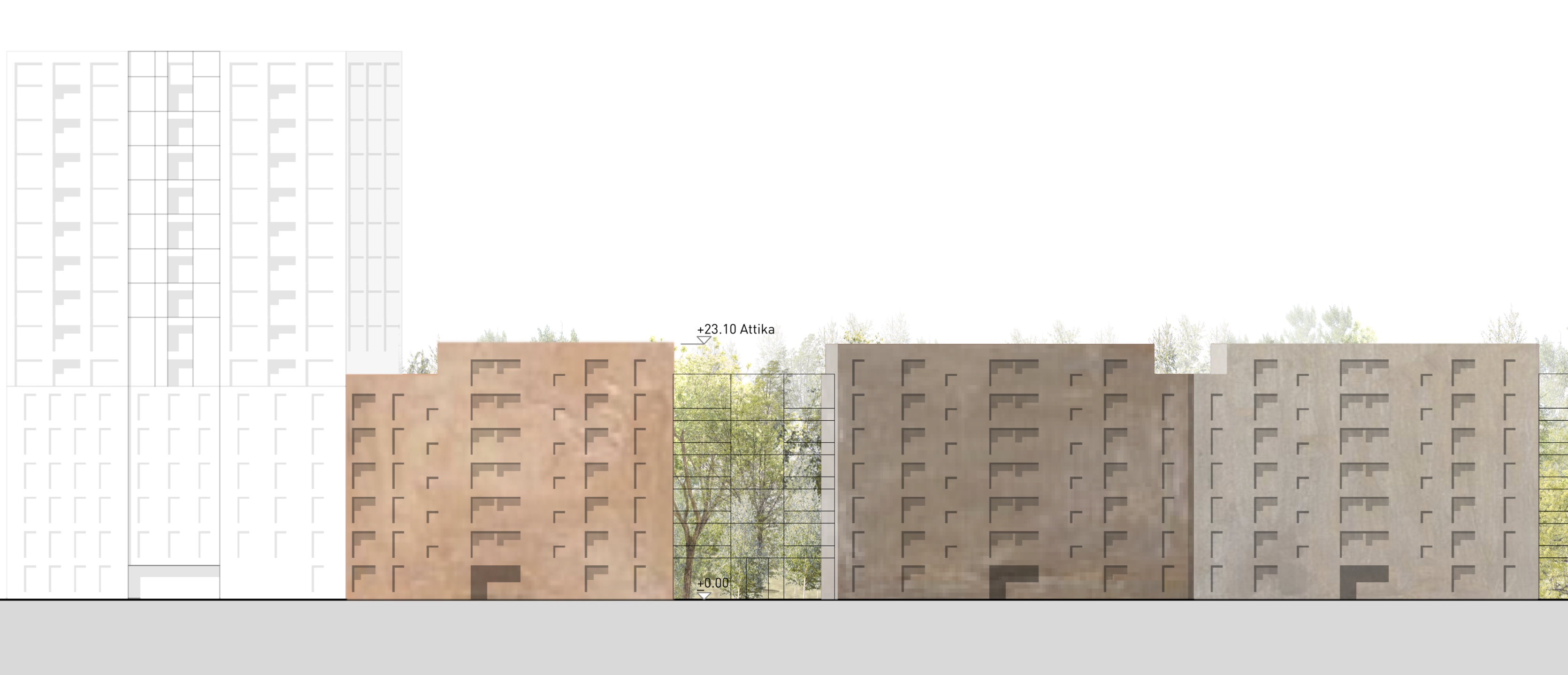 Grundsätzlich erscheinen die vorgeschlagenen Gebäude relativ tief. Die gezeigte Bebauungsdichte liegt deutlich über den geforderten Zielwerten. Dies erscheint jedoch lösbar, da die Gebäudetiefen punktuell verringert werden könnten, um noch bessere Wohnungsgrundrisse zu ermöglichen, ohne die Zielgröße der Dichte zu verfehlen. In der Nordostecke (Hochpunkt) ist im Weiteren zu untersuchen, wie auch hier qualitätvolles Wohnen realisiert werden könnte, wie dies in ähnlicher Situation an der Nord-West-Ecke im Entwurf gelingt. Zu untersuchen wäre, ob die dadurch resultierende Reduzierung von Geschossfläche durch ein weiteres Geschoß auf den nördlichen Gebäuden zu kompensieren wäre.