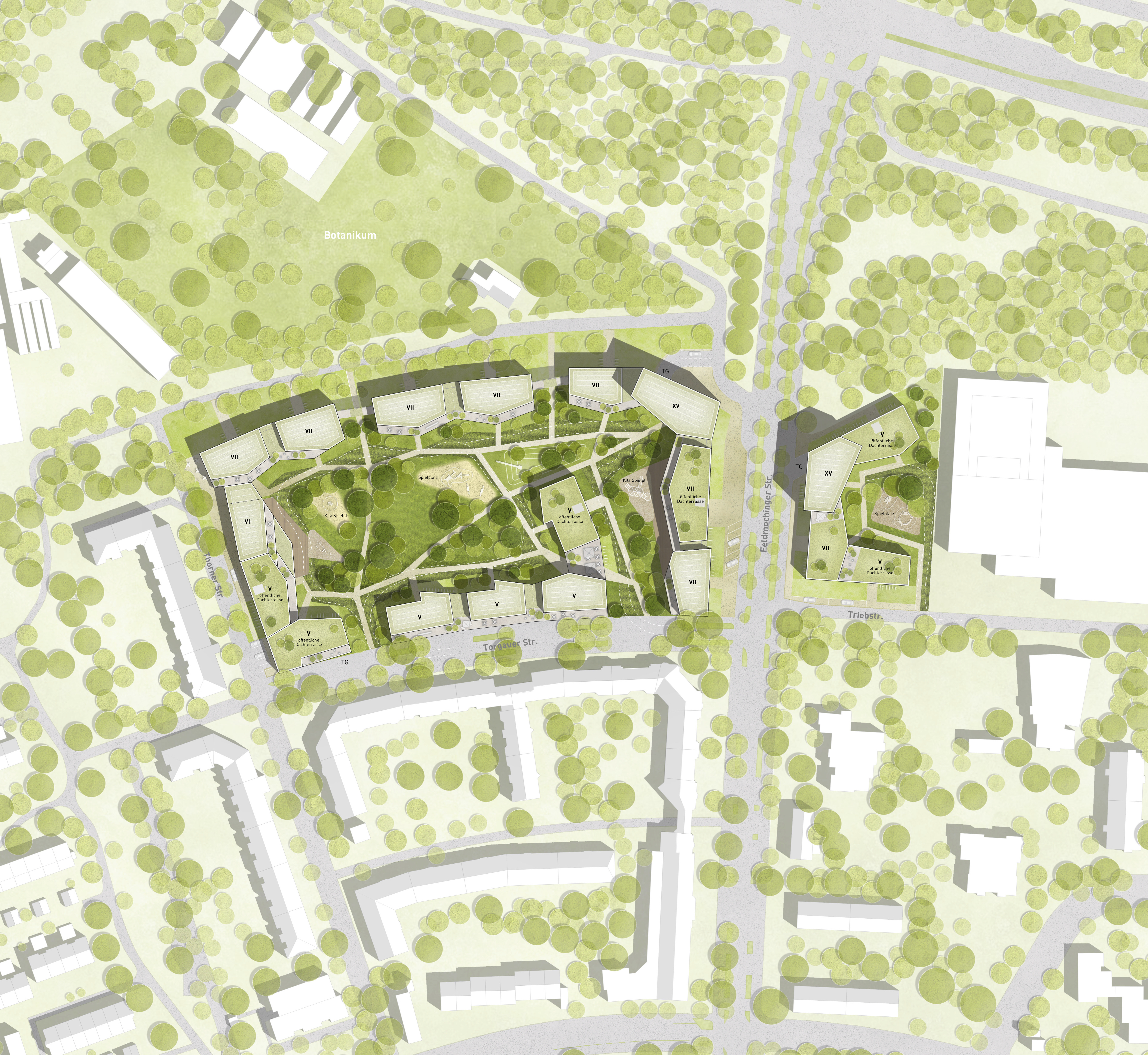 "Die geplante Bebauung erzeugt durch die präzise bauliche Rahmung des grünen Innenbereichs eine klare Trennung zwischen Öffentlichkeit und dem großen zusammenhängenden grünen Innenhof.