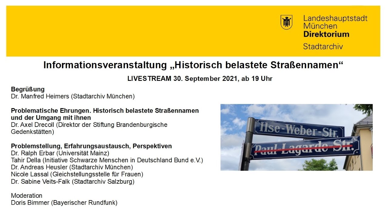 Am 30. September 2021 fand eine Informationsveranstaltung „Historisch belastete Straßennamen“ im Neues Rathaus statt.