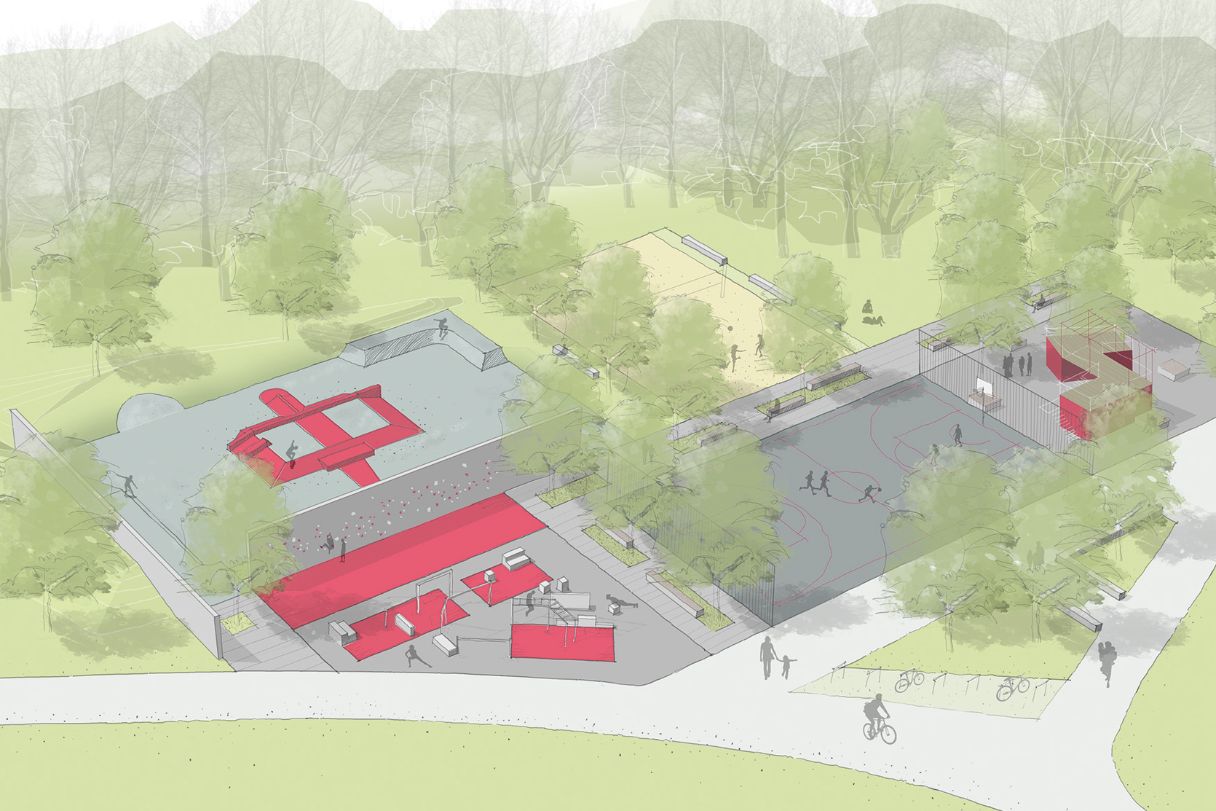 Im Südwesten sehen die Planungen eine Parkour-Anlage für Anfänger*innen und Geübte vor sowie eine lange Boulder- und Kletterstrecke entlang der vier Meter hohen Lärmschutzwand.