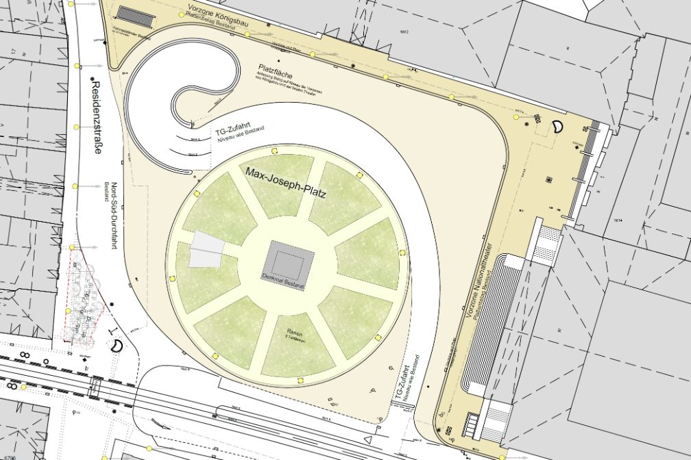 Die neue Gestaltung des auch als Opernplatz bekannten Max-Joseph-Platz basiert auf einem historischen Plan aus dem Umfeld von Leo von Klenze, der den Platz Anfang des 19. Jahrhunderts erstmalig gestaltete. Im Sinne des historischen Planungskonzepts ist ein auf das Denkmal zulaufendes Wegesystem entstanden. Ein Asphaltbelag mit Splittoberfläche befestigt die ganzjährig barrierefrei begehbaren Wege. Zwischen ihnen befinden sich acht rund 170 Quadratmeter große neuangelegte Rasenfelder. Die insgesamt rund 1.400 Quadratmeter Rasenflächen mit ihren rund 300.000 Litern Substratvolumen tragen durch die Retentions- und Verdunstungsleistung und einer geringen Wärmeabstrahlung zu einem besseren Mikroklima im Herzen der Stadt bei.