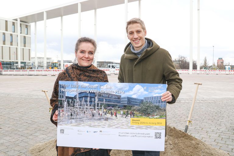 (27. März 2026) Bürgermeister Dominik Krause hat heute mit Baureferentin Dr.-Ing. Jeanne-Marie Ehbauer und der Regierungsvizepräsidentin von Oberbayern, Friederike Fuchs, den symbolischen Spatenstich für den Umbau des Willy-Brandt-Platzes in Riem gesetzt. Der zentrale Platz der Messestadt Riem ist bislang vollständig versiegelt und wird zu einem klimaangepassten, barrierefreien und attraktiven Aufenthaltsort mit vielfältiger Grünausstattung umgebaut. Grundlage der Planung sind Anregungen und Ideen aus der Bürgerschaft vor Ort.