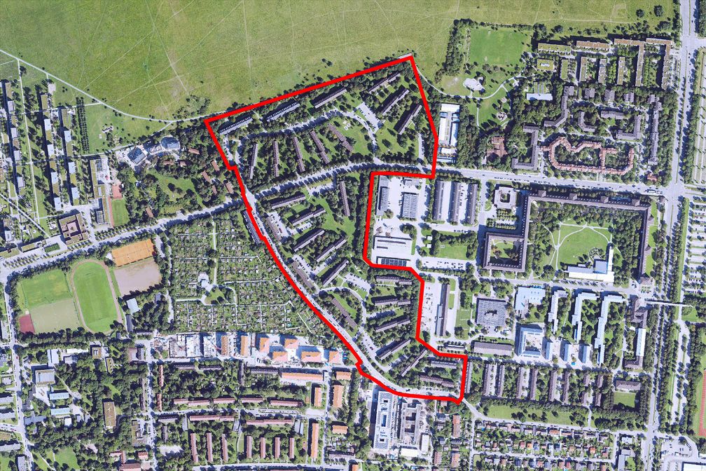 Das Planungsgebiet zirka 19 Hektar große Planungsgebiet liegt im Stadtbezirk 11 Milbertshofen - Am Hart. Als ehemalige Siedlung der amerikanischen Streitkräfte befinden sich die bebauten Flächen im Eigentum der Bundesanstalt für Immobilienaufgaben. Die öffentlichen Straßenverkehrsflächen der Neuherberg- und der Rockefellerstraße (inkl. Bügelerschließung) und des Morserings befinden sich im Eigentum der Landeshauptstadt München.