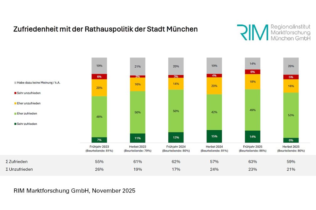 (10. November 2025) Bei den Münchnerinnen und Münchnern gibt es weiterhin eine breite Zustimmung zur Politik von Oberbürgermeister Dieter Reiter und zur Rathauspolitik insgesamt. Das ist das Ergebnis einer aktuellen Umfrage, die die RIM Marktforschung GmbH im Auftrag des Presse- und Informationsamts durchgeführt hat.