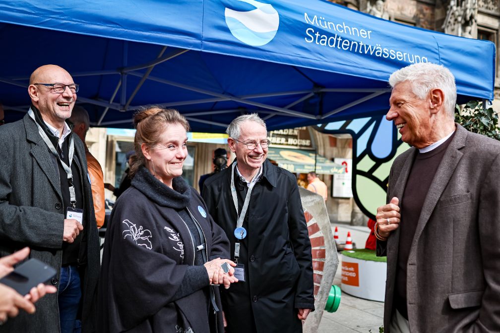 Oberbürgermeister Dieter Reiter und Baureferentin Dr.-Ing. Jeanne-Marie Ehbauer mit den Werkleitern der Münchner Stadtentwässerung Bernd Fuchs (rechts) und Robert Schmidt (links).