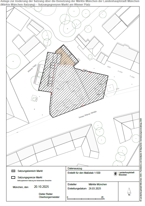 b) Plan für den Markt am Wiener Platz, Stand 26.03.2025, Maßstab 1:500, ausgefertigt am 20.10.2025 (Anlage 3) und
